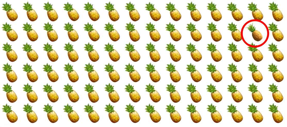 На изображението има много ананаси, те са показани в няколко реда. Вашата задача е да откриете специален ананас, който се различава от всички останали.