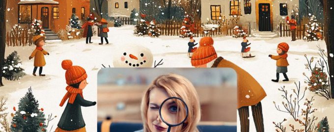 По-долу ще видите изображение на покрит със сняг площад, по който се разхождат хора. Някой играе със снежни топки, някой прави снежен човек или просто се любува на зимния пейзаж.