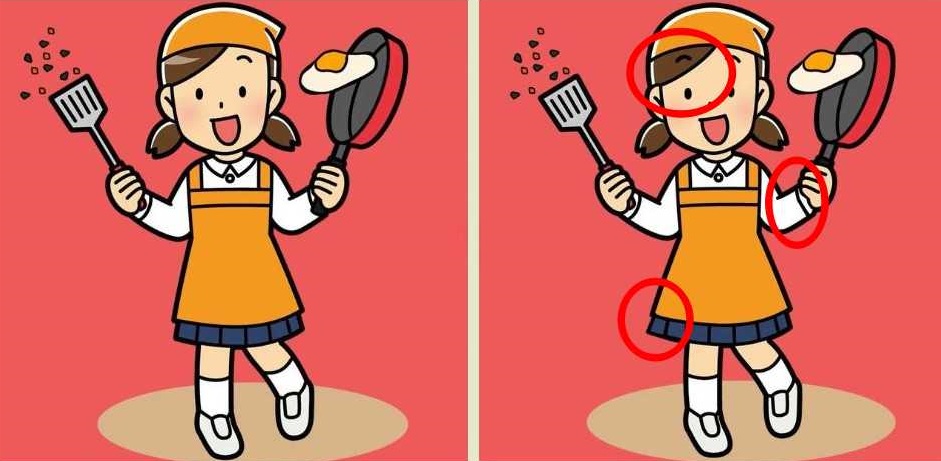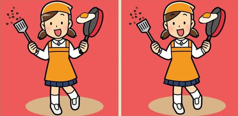 И на двете рисунки е изобразено момиче, което прави бъркани яйца. И изглежда, че тя е в беда, защото пърженото яйце е на път да падне на пода от тигана.