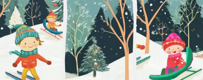 Пред вас е група щастливи деца, които се наслаждават на снега и истинското зимно време в гората. Най-малките се пързалят с шейни, а по-големите им приятели карат ски.