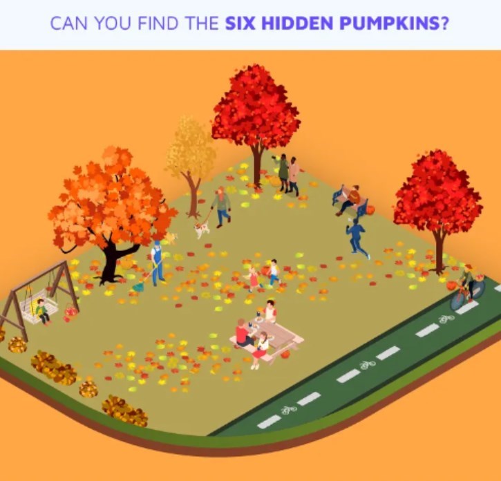 Трябва да откриете 6 тикви, като за решаването на задачата са ви дадени 10 секунди. Разгледайте внимателно дърветата и хората на детската площадка.
