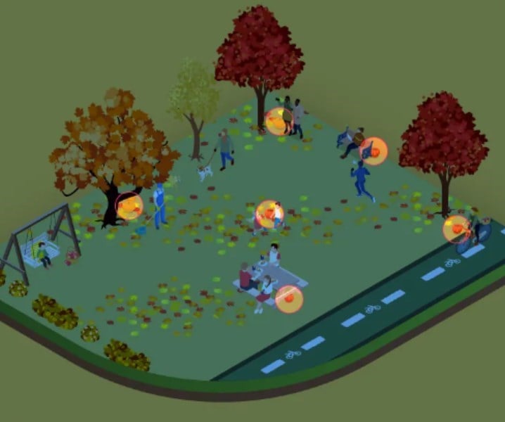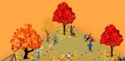Изображението показва есенна детска площадка, на която се разхождат хора и деца. Всеки е зает с нещо свое, но до някои от тях са тиквите, които търсим.